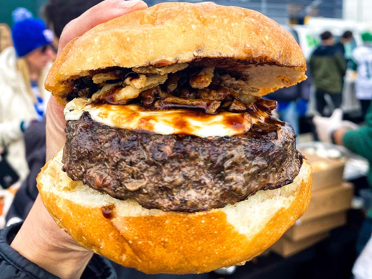 - The Mutz Burger, A Lafrieda blend of chuck/brisket/shortrib, grilled to a perfect medium, topped with fresh mozzarella, crispy onions, and smothered in our motor oil gravy