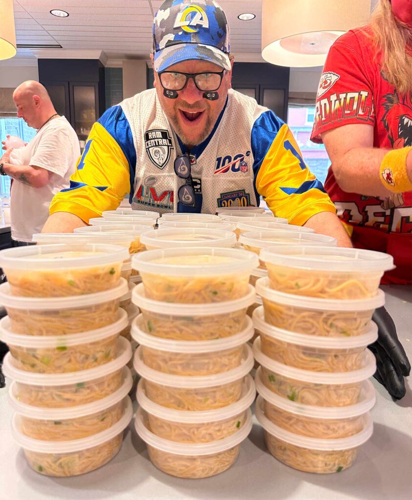 As great as it was in the draft theater, the best part of the weekend was spent nowhere near the theater, doing something completely unrelated to football. Fellow PFUFA member Sheree Pintea organized a day at the Kansas City Ronald Mcdonald House and asked me to run the cook team, made up of a group of fellow PFUFA members representing teams from around the league. We were tasked with making lunch on-site for 50 kids and their families. Of course, if you have been to a TailgateJoe party, food for 50 is going to end up being more like food for 100+!! The roster of volunteers pictured below left to right was: Monte Short, Toni Sides, Freddie Mclemore, Sheree Pintea, Jeff Christiansan, Jeff Rinehart, Karl Sides, Frank Monaco, TailgateJoe, Cheryl Stewart, Emily, Terri, and Lynn Schmidt